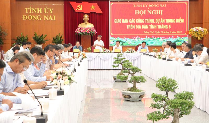(CTT-Đồng Nai) - Ngày 13-6, Phó Bí thư Thường trực Tỉnh uỷ, Tổ trưởng Tổ chỉ đạo các công trình, dự án trọng điểm của tỉnh Hồ Thanh Sơn đã chủ trì hội nghị giao ban các công trình, dự án trọng điểm trên địa bàn tỉnh tháng 6. Cùng tham dự hội nghị có Uỷ viên Trung ương Đảng, Bí thư Tỉnh uỷ Nguyễn Hồng Lĩnh; Phó Bí thư Tỉnh ủy, Trưởng Đoàn đại biểu Quốc hội tỉnh Quản Minh Cường; Quyền Chủ tịch UBND tỉnh Võ Tấn Đức và các đồng chí Uỷ viên Ban TVTU và lãnh đạo các sở, ngành, các địa phương.