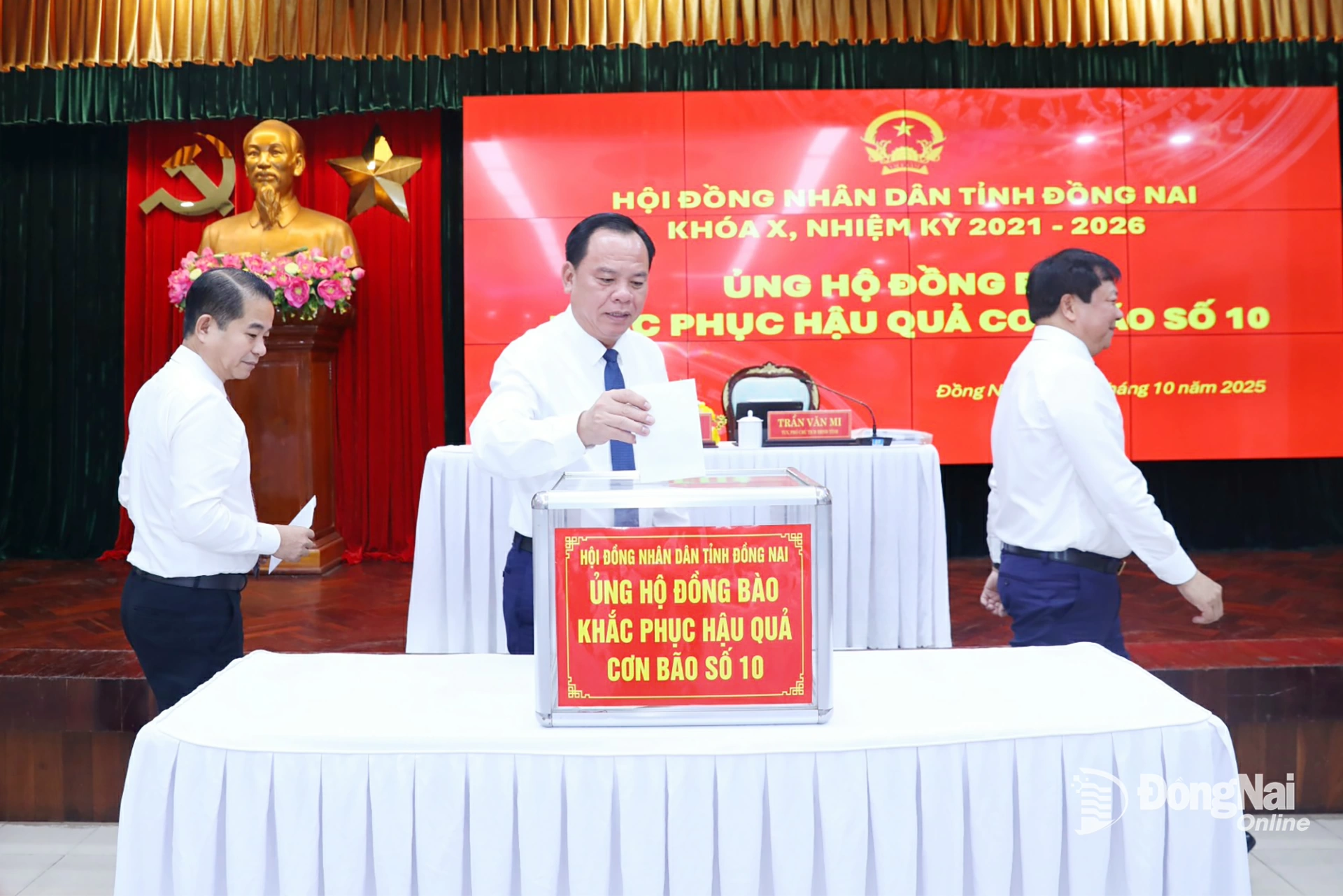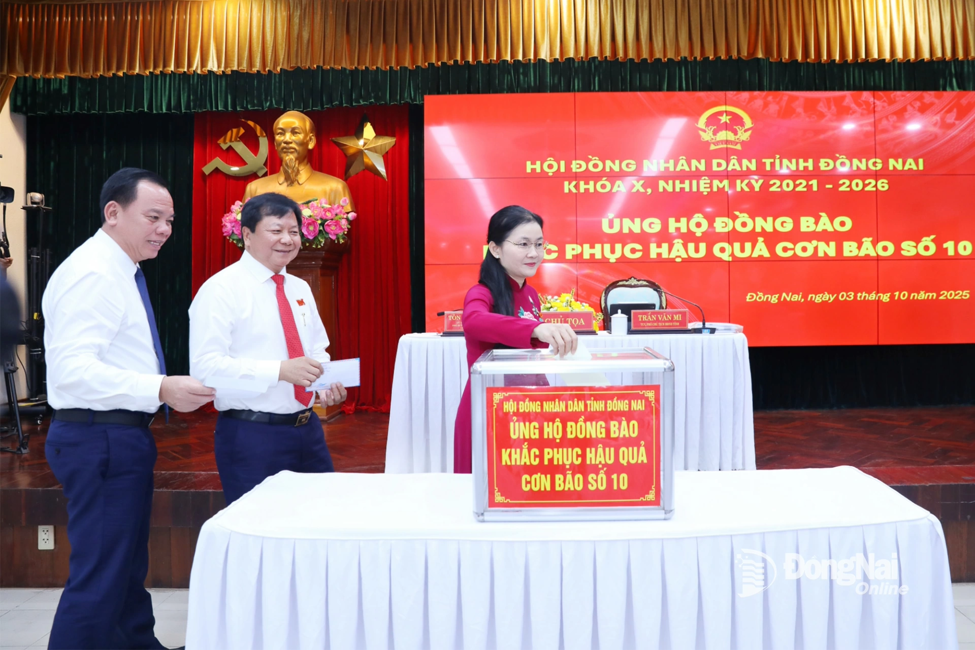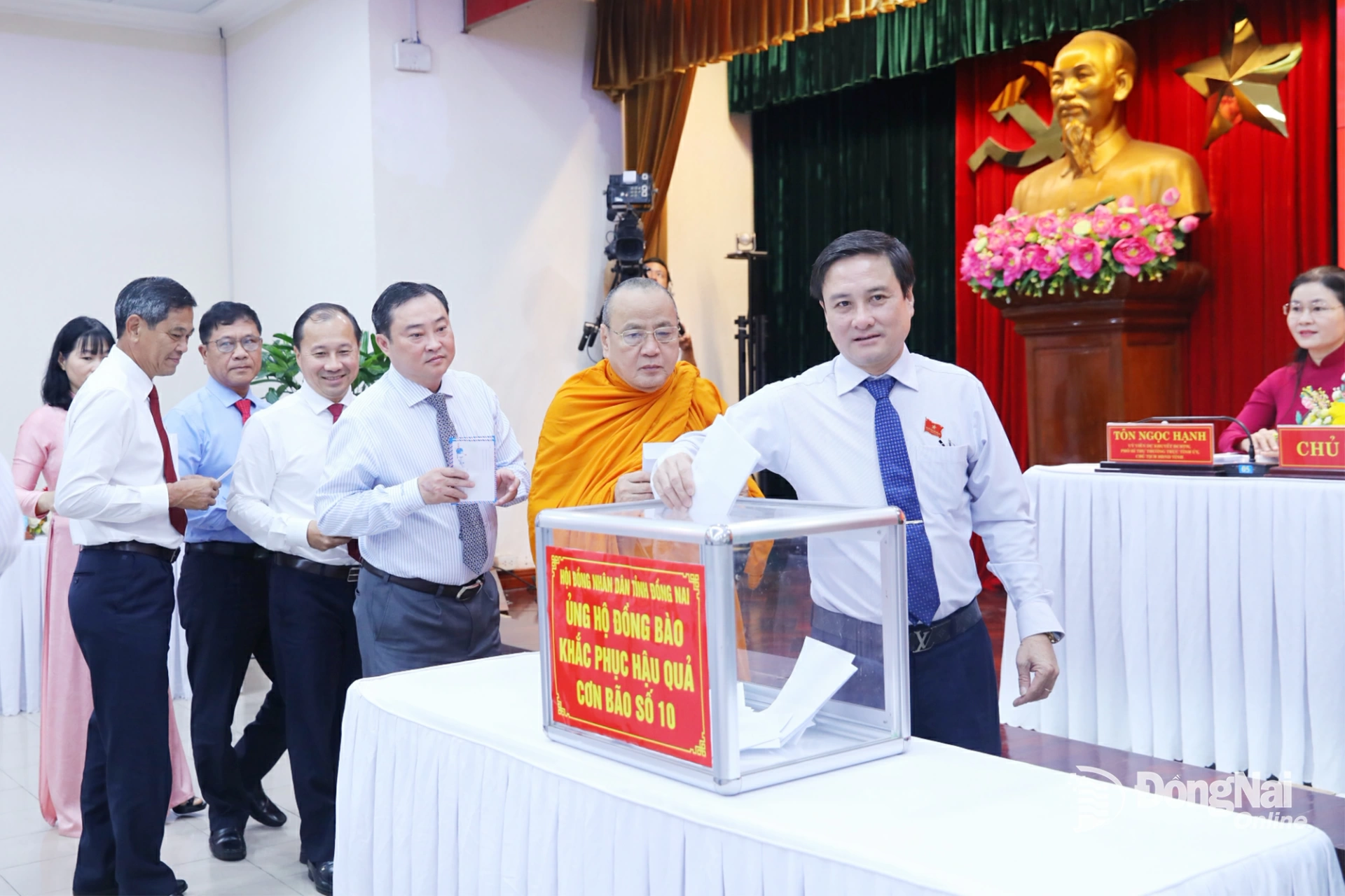 | Ủy viên dự khuyết Trung ương Đảng, Phó Bí thư Thường trực Tỉnh ủy, Chủ tịch HĐND tỉnh Đồng Nai Tôn Ngọc Hạnh và các đại biểu tham dự kỳ họp ủng hộ đồng bào khắc phục hậu quả cơn bão số 10. Ảnh: Huy Anh |
