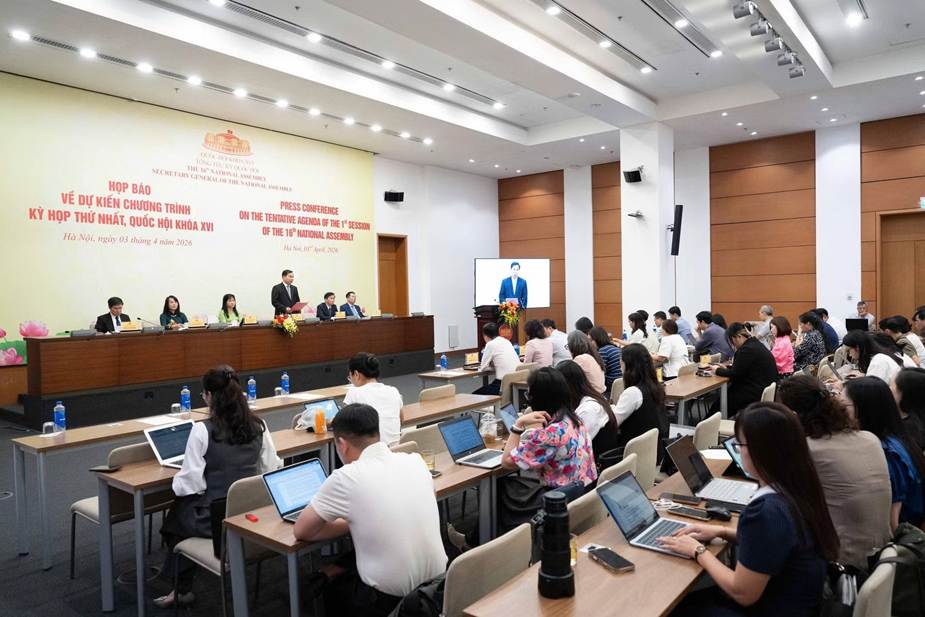 Quang cảnh Họp báo về dự kiến Chương trình Kỳ họp thứ nhất, Quốc hội khóa XVI ngày 3/4. (Ảnh: Media Quốc hội)