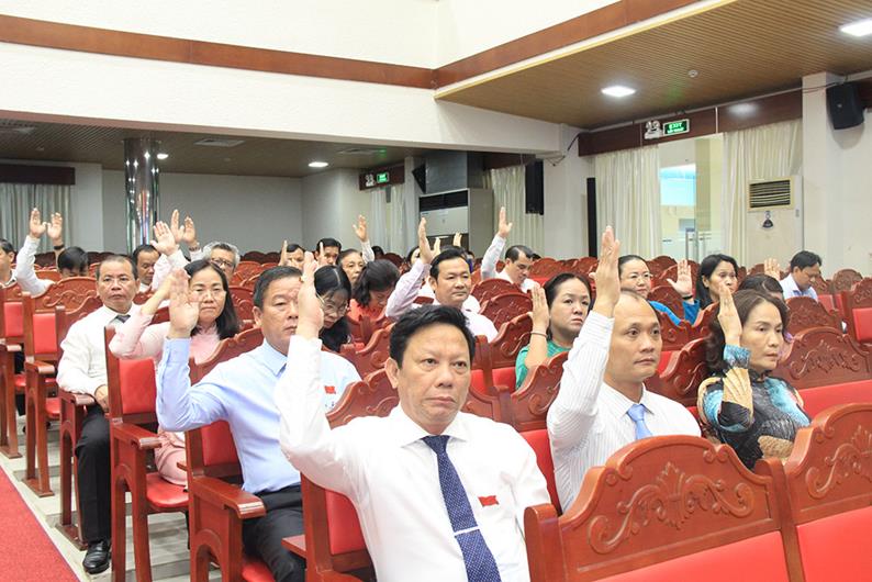 Các đại biểu HĐND tỉnh biểu quyết thông qua nghị quyết tại kỳ họp. Ảnh: An Hạ