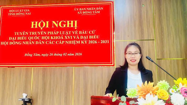 Luật gia Phan Thị Phương, Báo cáo viên trình bày tại Hội nghị tuyên truyền pháp luật về bầu cử đại biểu Quốc hội khóa XVI và đại biểu Hội đồng nhân dân các cấp nhiệm kỳ 2026 – 2031, tổ chức tại xã Đồng Tâm, tỉnh Đồng Nai.