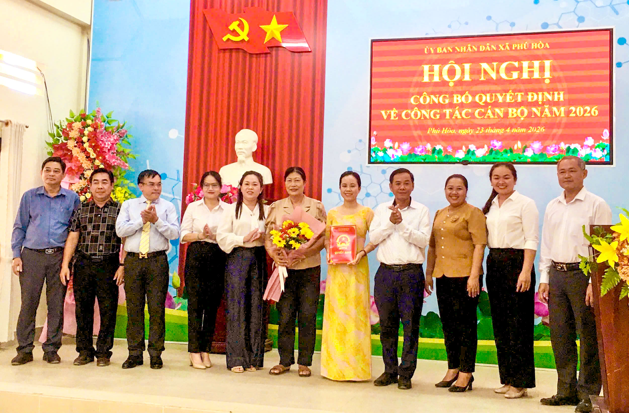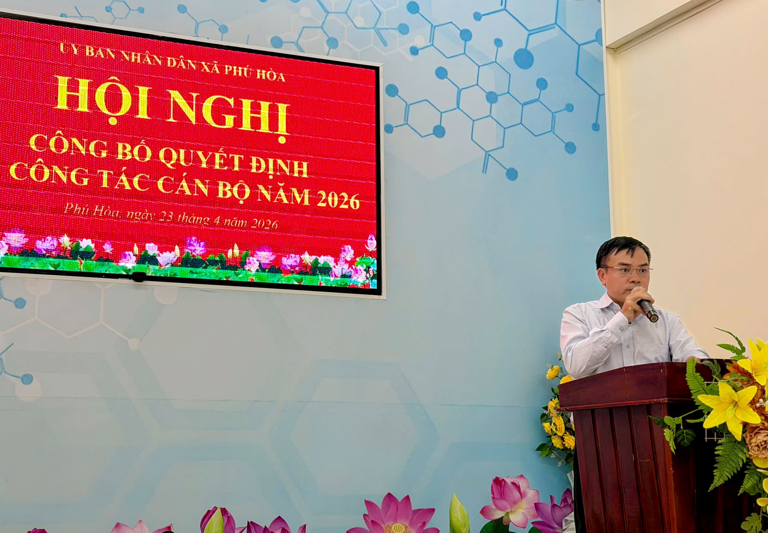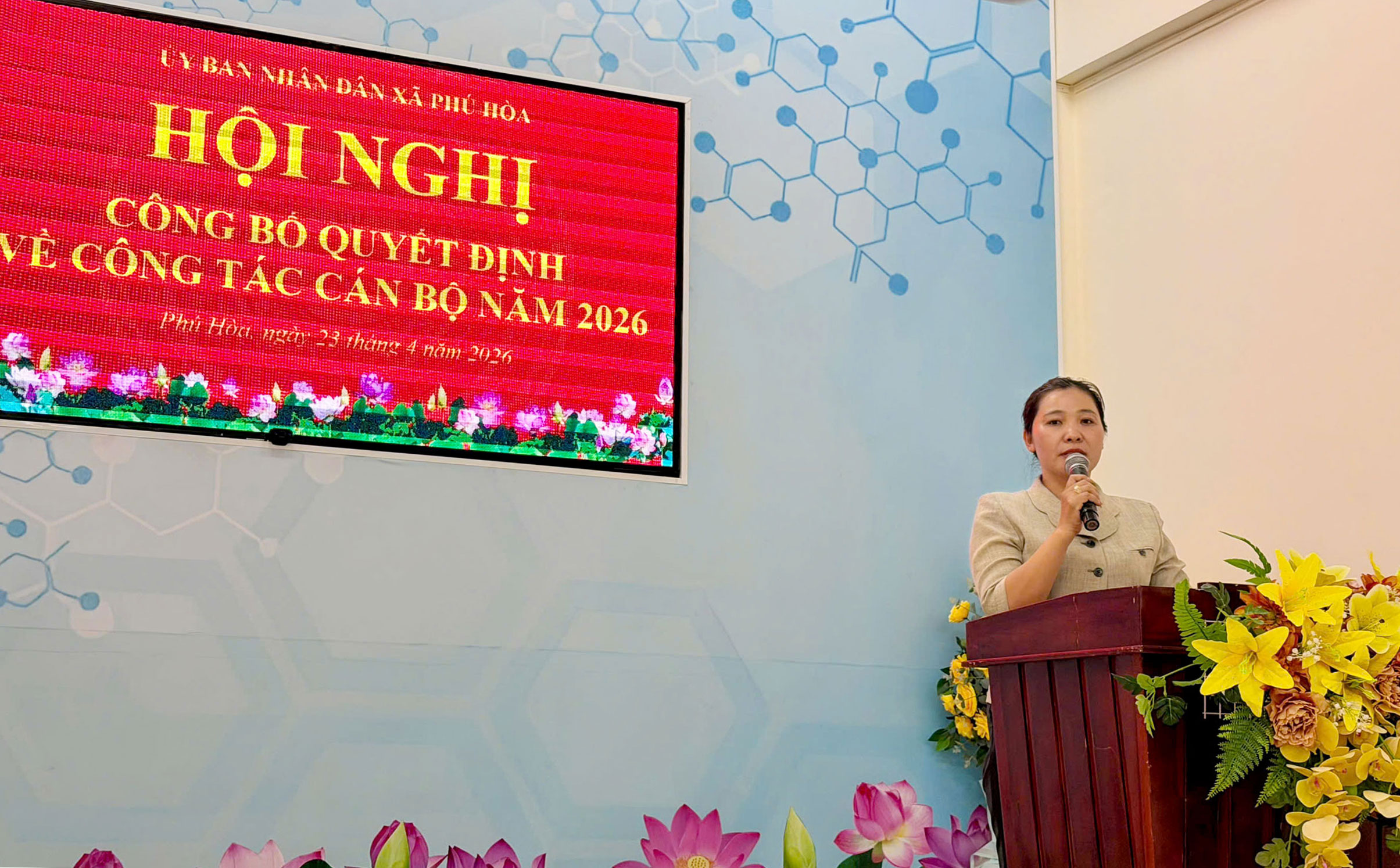 <p>&nbsp;</p><figure class="image"><img style="aspect-ratio:2284/1380;" src="https://dongnai.gov.vn/uploads/binhphuoc/news/2026_04/kkl.jpg" width="2284" height="1380" /></figure><figure class="image"><img style="aspect-ratio:2500/1640;" src="https://dongnai.gov.vn/uploads/binhphuoc/news/2026_04/kk_1.jpg" width="2500" height="1640" /><figcaption>Xã Phú Hoà công bố quyết định về công tác cán bộ</figcaption></figure><p style="text-align:justify;">Tại hội nghị, đại diện lãnh đạo phòng văn hoá xã đã công Quyết định về công tác cán bộ đối với đồng chí Đinh Thị Hương, Phó Chủ tịch Uỷ ban MTTQ Việt Nam xã, Chủ tịch Hội LHPN xã giữ chức danh Chủ tịch Hội Khuyến học và đồng chí Nguyễn Thị Ngọc Trâm, chuyên viên Phòng Văn hoá xã giữ chức danh Chủ tịch Hội Nạn nhân chất độc màu da cam xã Phú Hoà.</p><figure class="image"><img style="aspect-ratio:2475/1720;" src="https://dongnai.gov.vn/uploads/binhphuoc/news/2026_04/p7_1.jpg" width="2475" height="1720" /><figcaption>Đồng chí Nguyễn Văn Viện, &nbsp;Chủ tịch UBND xã đã chúc mừng đồng chí được phân công nhiệm vụ mới</figcaption></figure><p style="text-align:justify;">Phát biểu tại hội nghị, đồng chí Nguyễn Văn Viện, Chủ tịch UBND xã đã chúc mừng đồng chí được phân công nhiệm vụ mới, đồng thời đề nghị trên cương vị công tác, cần phát huy tinh thần trách nhiệm, đoàn kết, chủ động tham mưu, triển khai hiệu quả các phong trào khuyến học, khuyến tài; chú trọng vận động nguồn lực xã hội hóa, góp phần nâng cao dân trí, và bảo trợ nạn nhân chất độc màu da cam xã tại địa phương.</p><figure class="image"><img style="aspect-ratio:2409/1494;" src="https://dongnai.gov.vn/uploads/binhphuoc/news/2026_04/p5_3.jpg" width="2409" height="1494" /><figcaption>Đồng chí Đinh Thị Hương – Tân Chủ tịch Hội Khuyến học xã</figcaption></figure><p style="text-align:justify;">Phát biểu nhận nhiệm vụ, đồng chí Đinh Thị Hương – Tân Chủ tịch Hội Khuyến học xã bày tỏ sự cảm ơn trước sự tin tưởng của cấp ủy, chính quyền; đồng thời hứa sẽ tiếp tục nỗ lực, phát huy năng lực, cùng tập thể Hội Khuyến học xã thực hiện tốt nhiệm vụ, góp phần xây dựng phong trào học tập suốt đời ngày càng phát triển.</p>