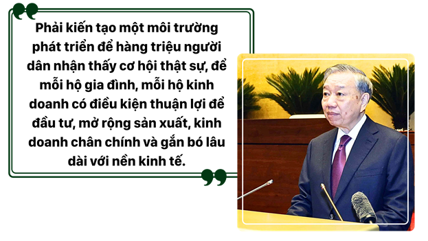 <p style="text-align: justify;">Vì vậy, phải kiến tạo một môi trường phát triển để hàng triệu người dân nhận thấy cơ hội thật sự, để mỗi hộ gia đình, mỗi hộ kinh doanh có điều kiện thuận lợi để đầu tư, mở rộng sản xuất, kinh doanh chân chính và gắn bó lâu dài với nền kinh tế. Đồng thời, phải bảo đảm rằng các doanh nghiệp nhìn thấy thể chế ổn định, minh bạch, chi phí tuân thủ hợp lý, hạ tầng đồng bộ và khả năng tiếp cận thị trường rộng mở, từ đó tạo ra động lực nội sinh mạnh mẽ, thúc đẩy sáng tạo, khởi nghiệp và phát triển bền vững.<br />