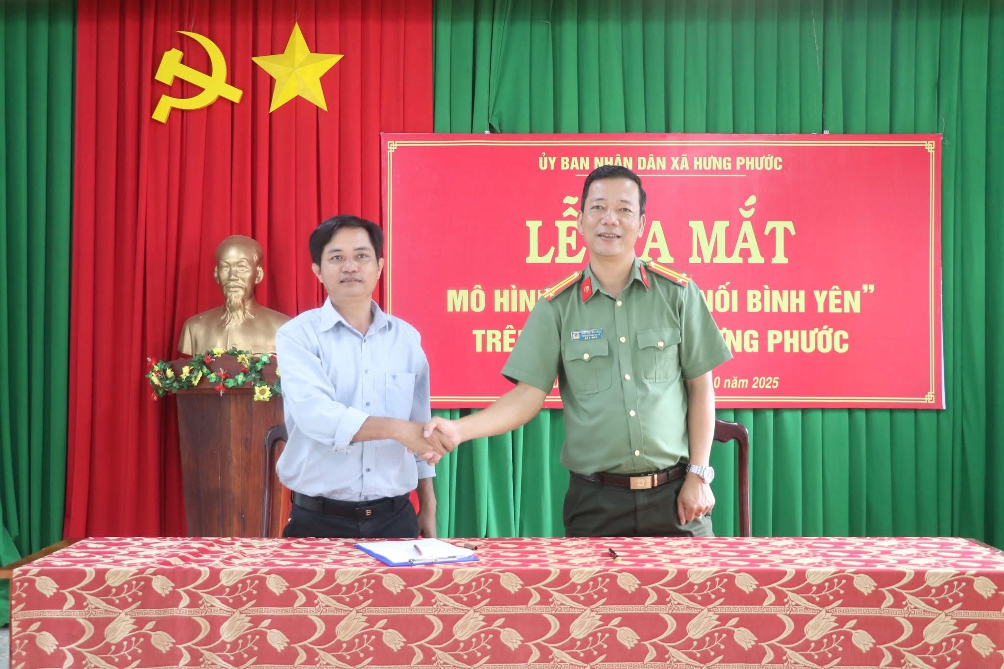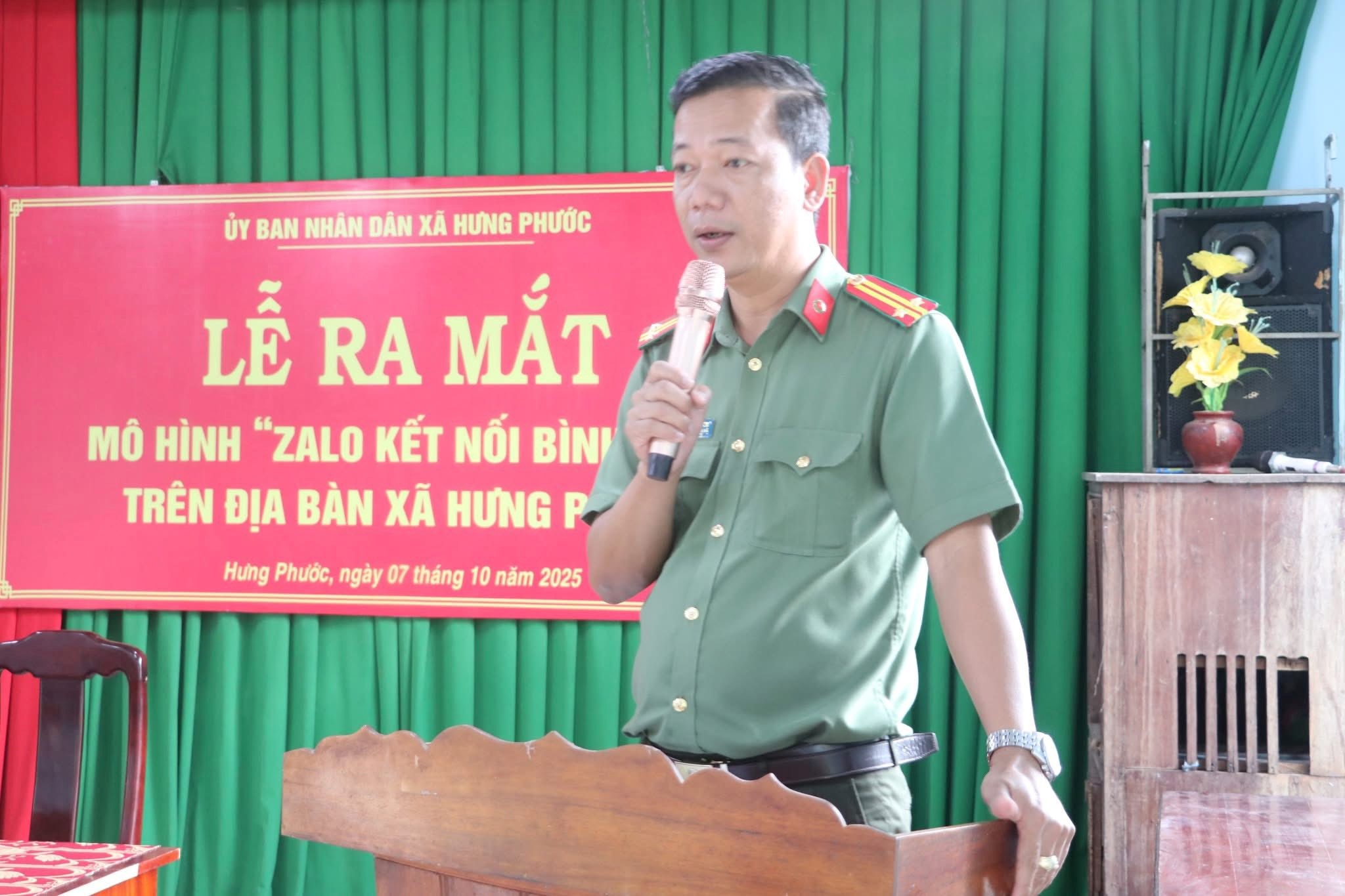 ![]() phát biểu tại Lễ ra mắt mô hình Thay mặt Ban Chỉ huy Công an xã, Trung tá Điểu Huỳnh Sơn – Trưởng Công an xã Hưng Phước cam kết chỉ đạo duy trì, vận hành mô hình thường xuyên, hiệu quả, thiết thực; tăng cường tương tác, lắng nghe, tiếp nhận và giải đáp thông tin từ người dân kịp thời, chính xác; bảo đảm bảo mật thông tin, thái độ tận tình, trách nhiệm, qua đó củng cố niềm tin, mối quan hệ gắn bó giữa lực lượng Công an và Nhân dân.
