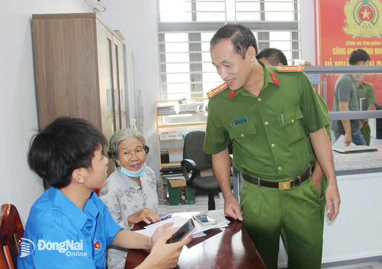 Đại tá Nguyễn Huy Hải trao đổi với tình nguyện viên tại Bộ phận Một cửa Công an phường Minh Hưng. Ảnh: Trần Danh