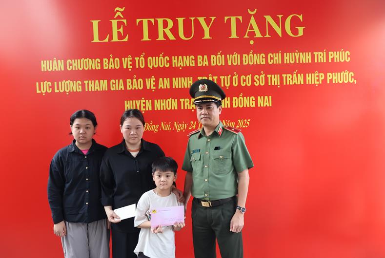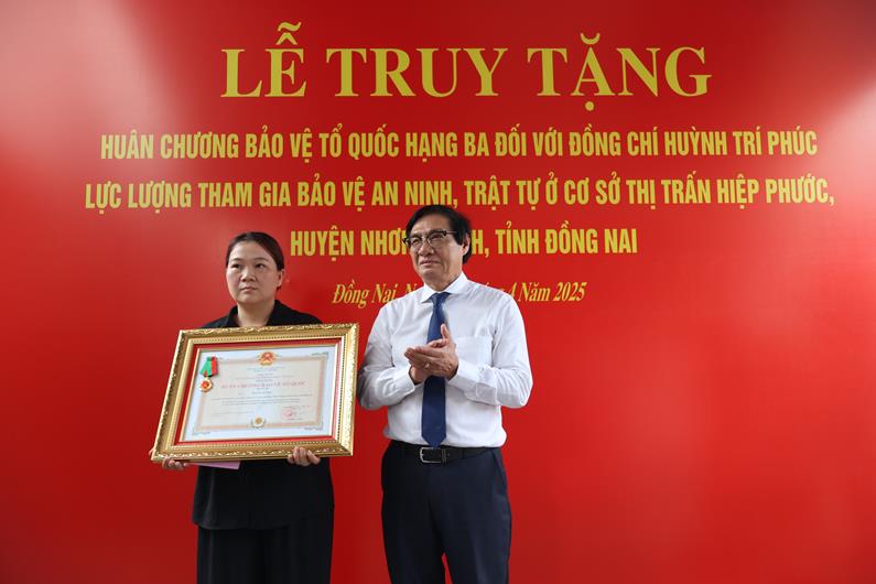 (CTT-Đồng Nai) - Sáng 24/4/2025, UBND tỉnh Đồng Nai đã tổ chức lễ truy tặng Huân chương Bảo vệ Tổ quốc hạng Ba cho đồng chí Huỳnh Trí Phúc, chiến sĩ lực lượng bảo vệ an ninh trật tự (ANTT) cơ sở thị trấn Hiệp Phước, huyện Nhơn Trạch, đã anh dũng hy sinh trong quá trình thực hiện nhiệm vụ. Buổi lễ được tổ chức trang trọng tại nhà riêng của đồng chí Phúc ở xã Phước Thiền, huyện Nhơn Trạch.