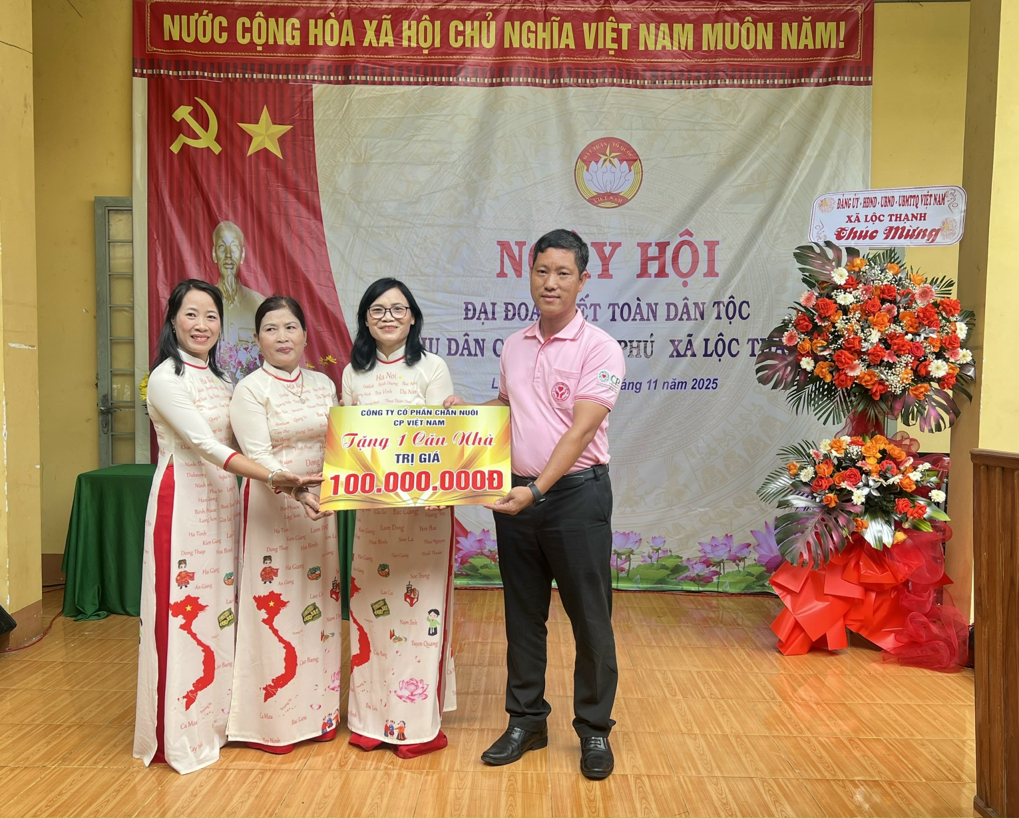 Đại diện Công ty cổ phần CP đã trao tặng 100 triệu đồng để xây dựng nhà đại đoàn kết