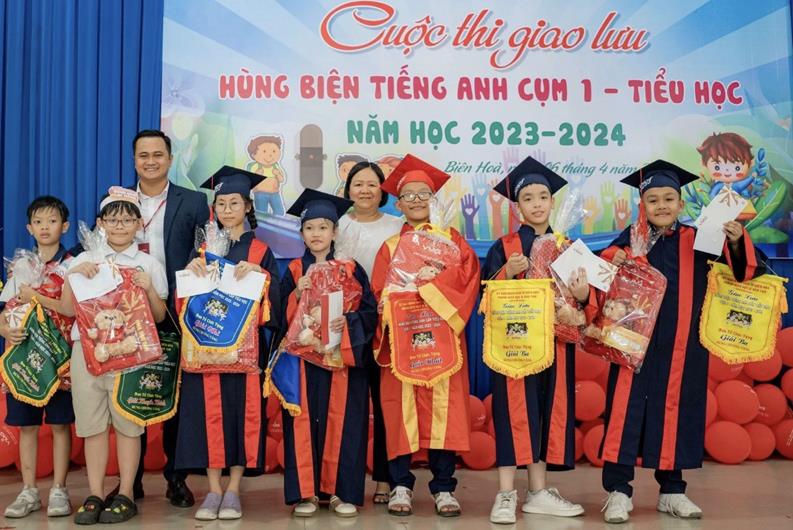 Các học sinh đoạt giải trong cuộc thi giao lưu hùng biện Tiếng Anh cụm 1 bậc tiểu học năm học 2023-2024 thành phố Biên Hòa được trao thưởng