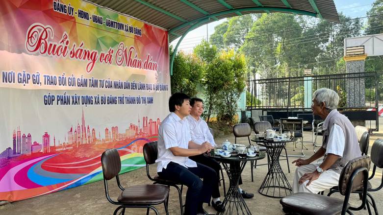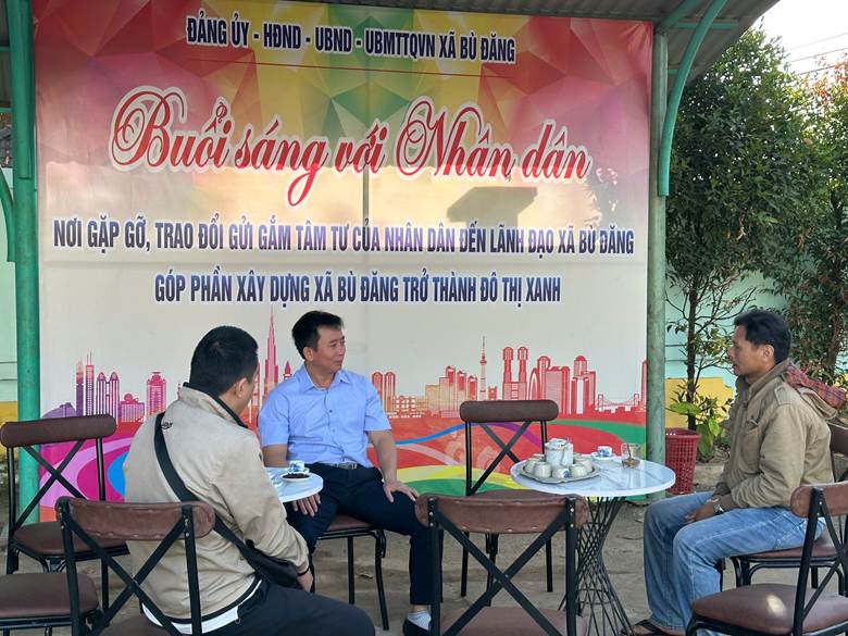 Lãnh đạo xã Bù Đăng lắng nghe, tiếp nhận ý kiến của người dân đến với mô hình "“Cà-phê sáng - lắng nghe, trao đổi với nhân dân”.