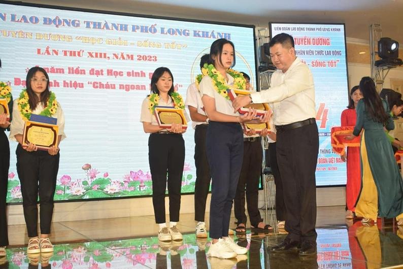 Tại TP.Long Khánh, LĐLĐ thành phố vừa tổ chức tuyên dương, khen thưởng 390 cháu con đoàn viên, công nhân viên chức lao động Học giỏi, sống tốt năm 2023. Trong đó, có 179 cháu bậc tiểu học, 164 cháu bậc THCS, 45 cháu bậc THPT và 2 cháu đại học. Dịp này, LĐLĐ thành phố trao học bổng cho 4 cháu học giỏi có hoàn cảnh đặc biệt khó khăn và đề nghị Công đoàn cấp tỉnh khen thưởng 20 cháu.