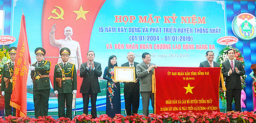 Ngày 26-12, huyện Thống Nhất đã tổ chức họp mặt kỷ niệm 15 năm xây dựng và phát triển (1-1-2004 - 1-1-2019); đón nhận Huân chương Lao động hạng Ba. Chủ tịch UBND tỉnh Đinh Quốc Thái; Thường trực Tỉnh ủy, Trưởng ban Tổ chức Tỉnh ủy Phạm Văn Ru; Trưởng ban Tuyên giáo Tỉnh ủy Thái Bảo; Trưởng ban Dân vận Tỉnh ủy Hồ Thanh Sơn; Phó Chủ tịch UBND tỉnh Nguyễn Hòa Hiệp đã dự.