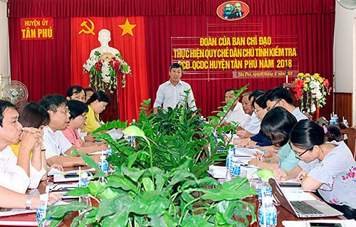 Ngày 7-6, đoàn kiểm tra của Ban chỉ đạo thực hiện Quy chế dân chủ (QCDC) tỉnh do Ủy viên Ban Thường vụ Tỉnh ủy, Trưởng ban Dân vận Tỉnh ủy Hồ Thanh Sơn làm trưởng đoàn đã kiểm tra việc thực hiện QCDC tại huyện Tân Phú. Cùng tham gia đoàn có Phó trưởng Ban Tuyên giáo Tỉnh ủy Phạm Tấn Linh; Phó chủ tịch thường trực Ủy ban Mặt trận Tổ quốc (MTTQ) Việt Nam tỉnh Nguyễn Văn Dũng và các thành viên Ban chỉ đạo QCDC của tỉnh.