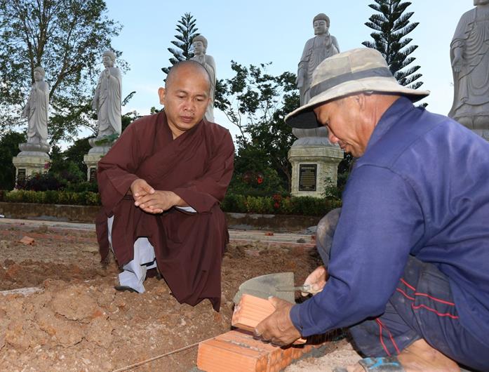 Đại đức Thích Trung Điền, trụ trì chùa Phóng Sanh, xã Lang Minh, H.Xuân Lộc trò chuyện cùng người lao động tại địa phương