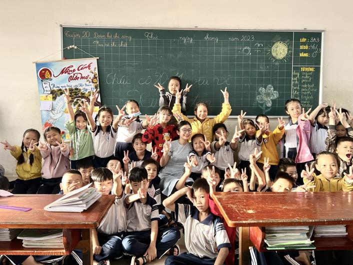 Chị Hoàng Ngọc Kim Cương (giữa) chụp hình với học trò của mình tại Trường TH-THCS-THPT Trần Đại Nghĩa