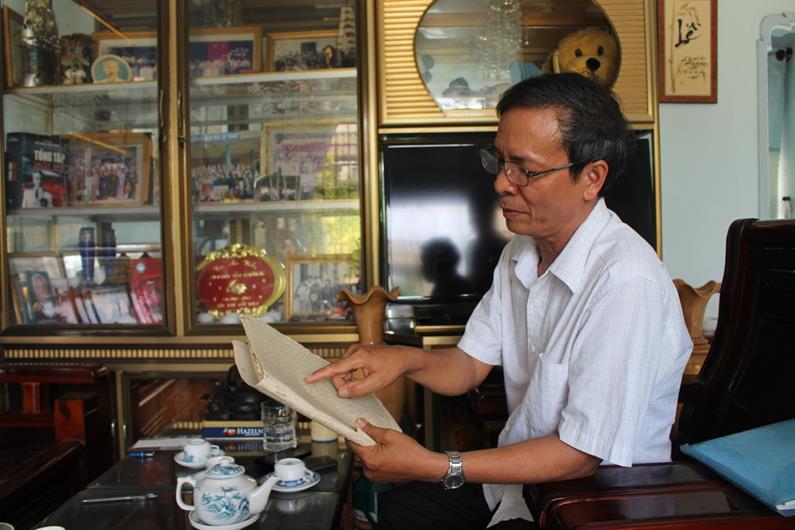 Cựu chiến binh Nguyễn Văn Chương bên cuốn nhật ký ghi chép lại sự kiện bảo vệ cầu Ghềnh ngày 30-4-1975