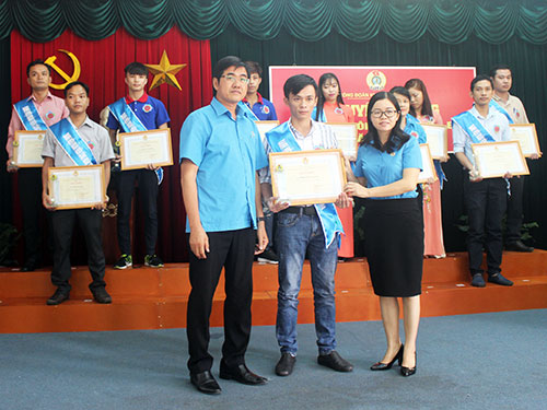 Chủ tịch Công đoàn KCN Biên Hòa Nguyễn Thị Tuyết và Phó trưởng ban quản lý các KCN tỉnh Phạm Văn Cường trao thưởng cho các đoàn viên Công đoàn tiêu biểu năm 2018.