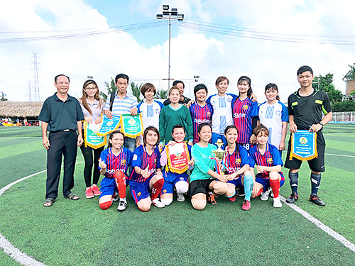 Lãnh đạo LĐLĐ huyện Nhơn Trạch trao giải và chụp hình cùng các đội bóng tham dự hội thao CNVCLĐ huyện nhân Tháng công nhân năm 2018.