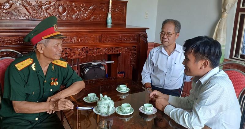 Cựu chiến binh Lâm Cảnh Cần (trái) đón và tiếp chuyện với các đoàn đến thăm nhân dịp lễ 30-4-2024