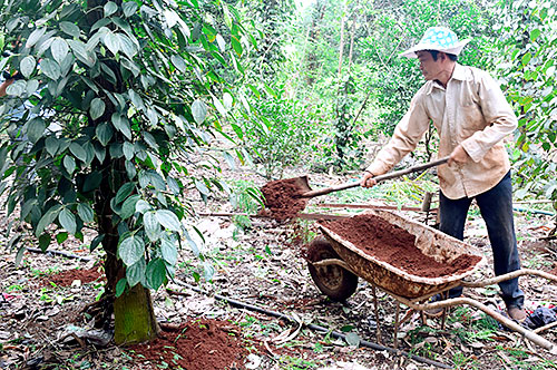 Ông Đỗ Văn Hoàng chăm sóc vườn tiêu.