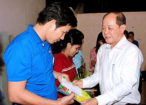 Chủ tịch LĐLĐ huyện Nhơn Trạch khóa IV Lê Văn Vang trao quà Tết cho CNLĐ có hoàn cảnh khó khăn.