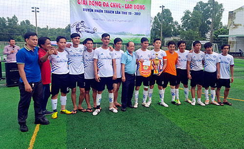 Chủ tịch LĐLĐ huyện Nhơn Trạch khóa IV Lê Văn Vang trao thưởng cho đội có thành tích xuất sắc tại giải bóng đá CNVCLĐ huyện năm 2017.