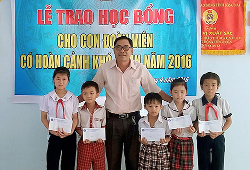 Chủ tịch Công đoàn huyện Vĩnh Cửu Nguyễn Công Ký trao học bổng cho con đoàn viên có hoàn cảnh khó khăn.