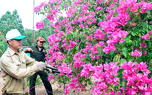 Khoảng 9 giờ sáng trung tuần tháng 4, anh Võ Văn Hùng cùng một số nhân viên của Khu bảo tồn tiếp tục chăm sóc đường hoa, phát cành, dọn cỏ… tại khu vực Bà Hào (thuộc xã Mã Đà). Anh Hùng chia sẻ, anh cùng anh em được phân công làm công việc này đã 7 năm nay. Không chỉ chăm sóc đường hoa Chiến khu Đ, các anh còn chăm sóc cây kiểng, thảm cỏ… trong khuôn viên rộng hơn 10 ha của Trung tâm văn hóa, du lịch (thuộc Khu bảo tồn). Công việc hằng ngày của các anh là cắt tỉa hàng rào trồng cây xanh, tạo dáng cây kiểng, hàng hoa, xịt thuốc dọn cỏ, đắp bồn, tưới nước, bón phân… “Riêng cây bông giấy chỉ nở hoa vào mùa khô, bắt đầu từ trước Tết Nguyên đán cho đến đầu mùa mưa. Đặc trưng của loài này, thời tiết càng nắng nóng thì cây nở hoa càng nhiều. Tùy theo từng mùa mà chúng tôi chăm sóc cây hoa giấy khác nhau. Ví dụ, mùa mưa, chúng tôi tập trung dọn cỏ, tỉa cành, bón phân. Mùa khô, chúng tôi đắp bồn tưới nước đều đặn để cây ra hoa đẹp”, anh Hùng chia sẻ.