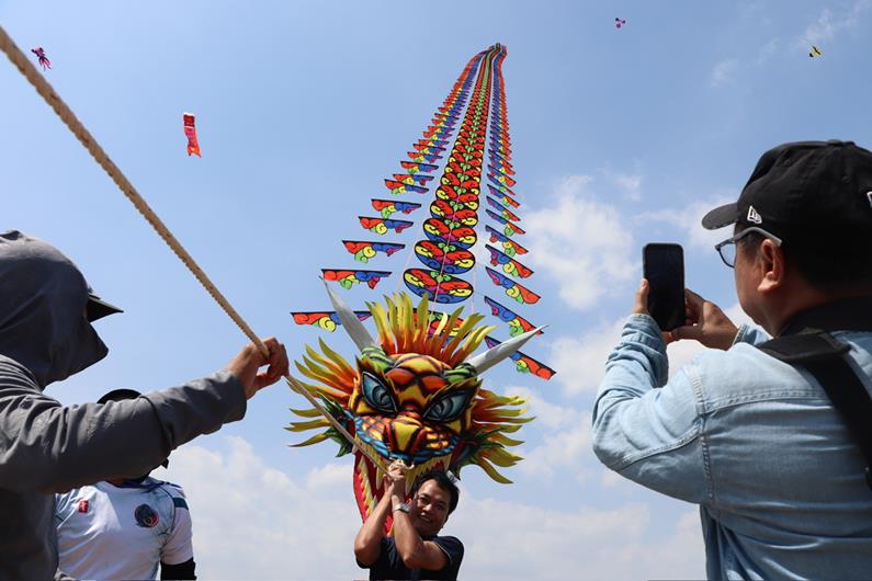 Nhiều người dân thích thú chụp hình với con diều hình rồng dài 120m trong ngày hội diều sáo xã Sông Ray