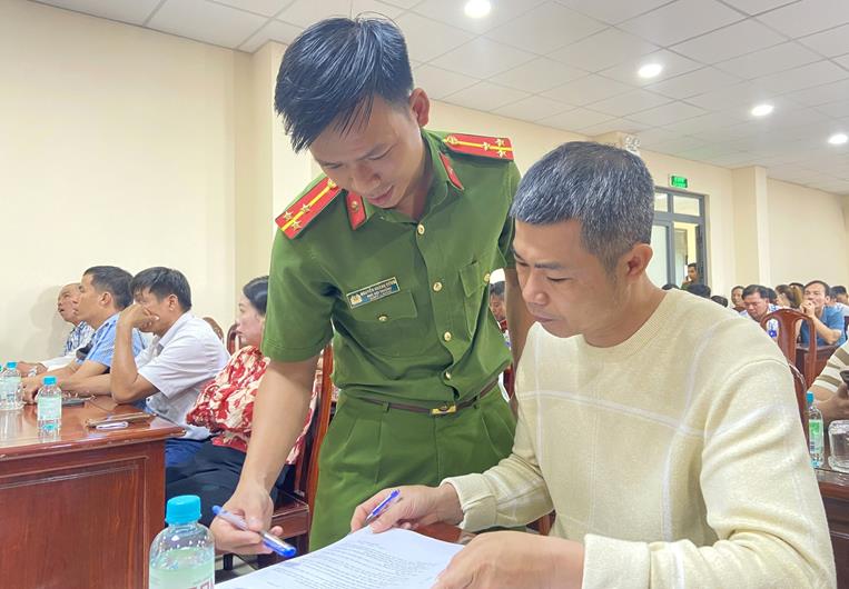 Công an huyện Nhơn Trạch hướng dẫn chủ cơ sở ký cam kết tuân thủ các quy định về giữ gìn an ninh trật tự