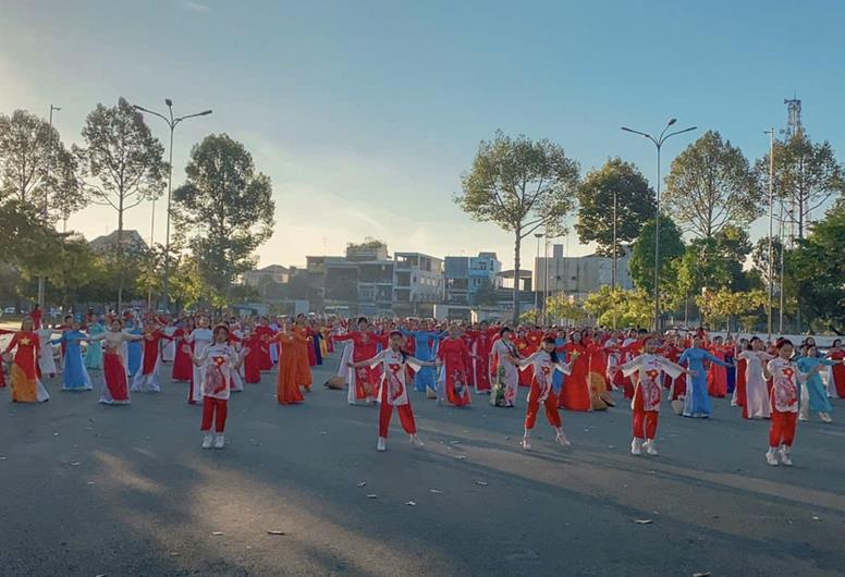 Các diễn viên không chuyên luyện tập đồng diễn dân vũ, xếp hình nghệ thuật 325 năm Biên Hòa, Đồng Nai