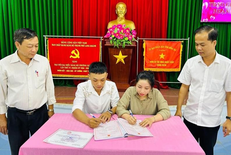 Người dân trên địa bàn phường Xuân An, thành phố Long Khánh đăng ký kết hôn và được phường trao thư chúc mừng