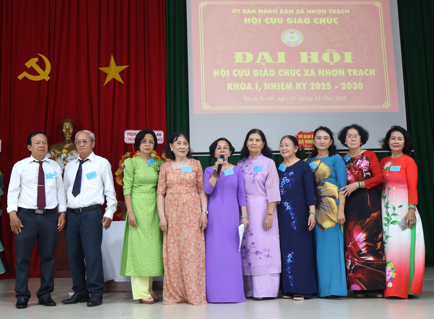 Bà Huỳnh Thị Mai Hoa (thứ 5 từ trái sáng) được tín nhiệm giữ chức Chủ tịch Hội Cựu giáo chức xã Nhơn Trạch khóa I, nhiệm kỳ 2025 – 2030