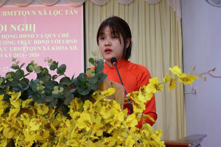 Bà Bùi Thị Ánh Huyền - Chủ tịch UBMTTQVN xã đọc báo cáo tình hình thực hiện Quy chế phối hợp hoạt động giữa Thường trực Hội đồng nhân dân với Ủy ban nhân dân và Ban Thường trực Ủy ban Mặt trận Tổ quốc Việt Nam xã Lộc Tấn khóa XII, nhiệm kỳ 2021-2026. Ảnh: Thúy Anh