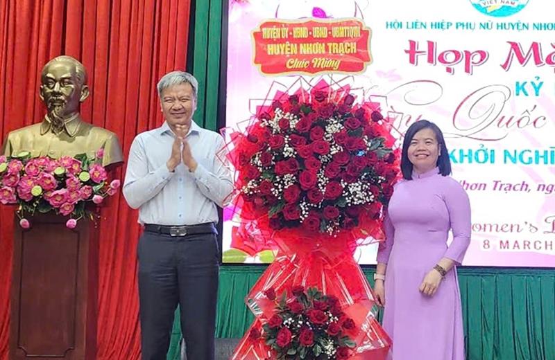 Bí thư Huyện uỷ Nhơn Trạch Từ Nam Thành tặng lẳng hoa chúc mừng Hội LHPN huyện