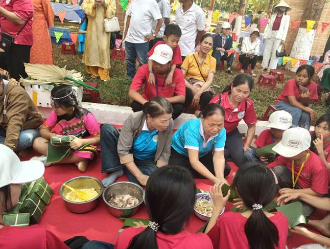 Cán bộ, hội viên Hội Liên hiệp Phụ nữ xã Hưng Phước hướng dẫn các con nuôi của Hội nữ doanh nhân gói bánh tét và bánh chưng Tham gia Chương trình “Xuân biên cương – Tết có mẹ”