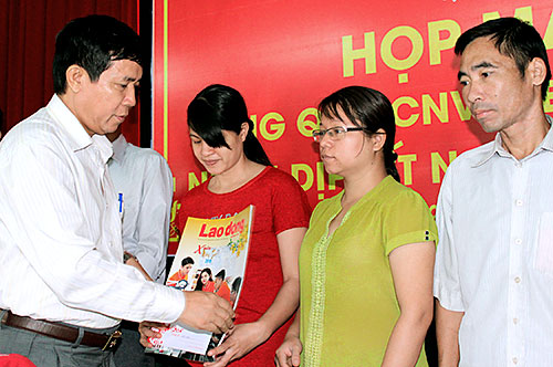 Chủ tịch LĐLĐ huyện Trảng Bom Lê Đức Thụy trao quà Tết cho công nhân có hoàn cảnh khó khăn.