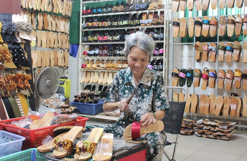 Bà Đặng Thị Nga có hơn 50 năm giữ nghề đóng guốc mộc truyền thống tại chợ Biên Hòa