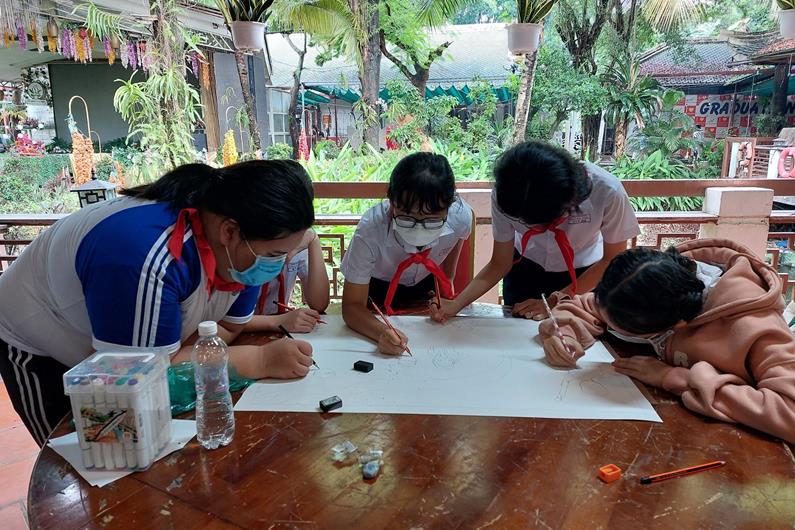 Các em học sinh tham gia phần thi vẽ tranh theo sách hè năm 2023