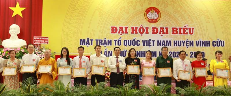 Bí thư Huyện ủy Vĩnh Cửu Nguyễn Văn Thuộc khen thưởng tập thể, cá nhân có đóng góp tích cực trong hoạt động Mặt trận nhiệm kỳ qua.