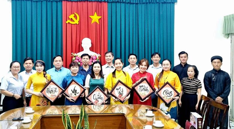Lãnh đạo Trung tâm Chính trị huyện, thầy giáo và các học viên của lớp học chữ thư pháp chụp hình lưu niệm tại lễ bế giảng