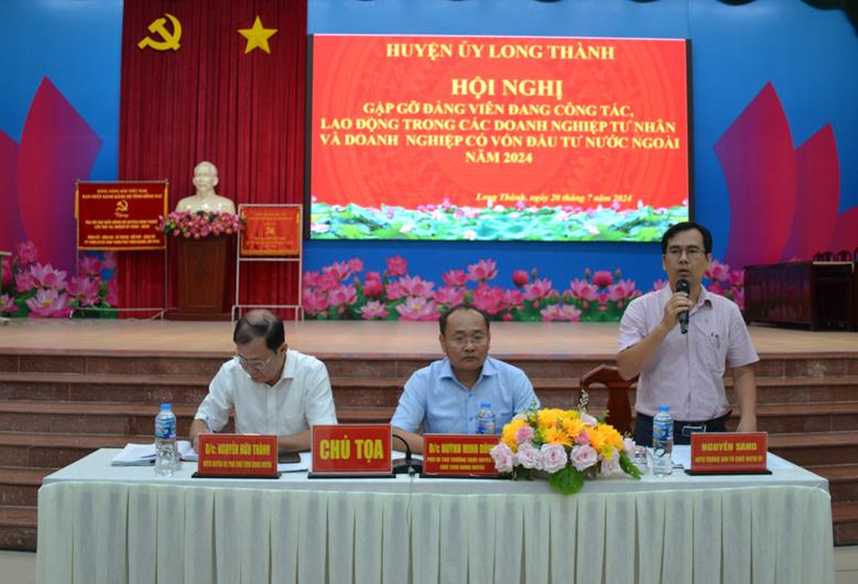 (CTT-Đồng Nai) - Huyện ủy Long Thành đã tổ chức gặp gỡ gần 200 đảng viên đang làm việc trong các doanh nghiệp (DN) tư nhân, DN có vốn đầu tư nước ngoài để thông tin tình hình kinh tế - xã hội của huyện 6 tháng đầu năm; công tác tổ chức xây dựng Đảng tại các DN trên địa bàn huyện và lắng nghe các ý kiến, tâm tư, nguyện vọng của các đảng viên trong DN.