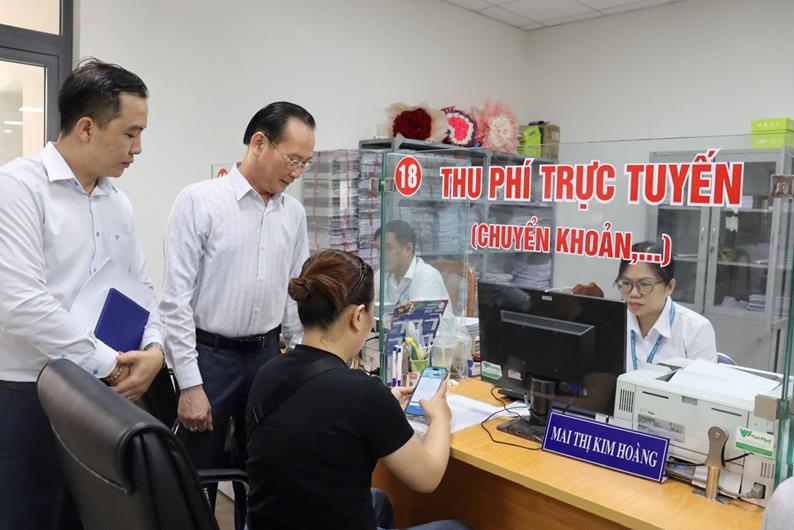 Đại diện Ban Chỉ đạo cải cách hành chính huyện hướng dẫn người dân thanh toán trực tuyến tại bộ phận một cửa