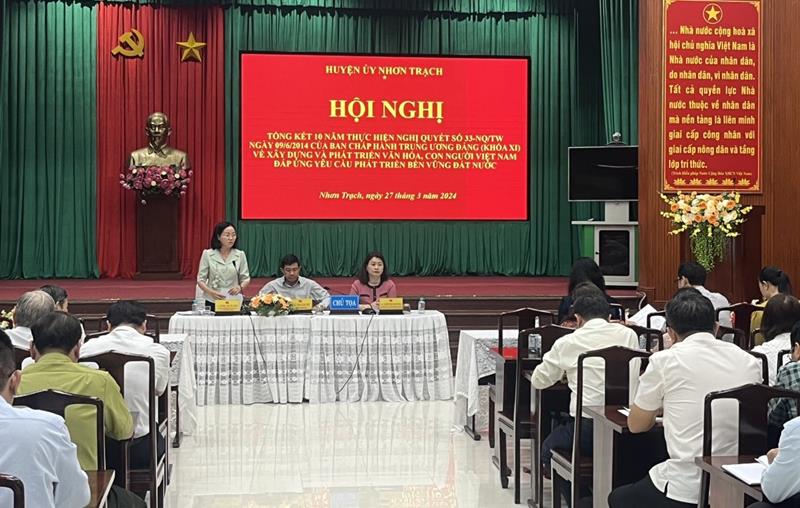 (CTT-Đồng Nai) - Ngày 27-3, Ban Thường vụ Huyện ủy Nhơn Trạch đã tổ chức Hội nghị tổng kết 10 năm thực hiện Nghị quyết số 33-NQ/TW ngày 9-6-2014 của Ban Chấp hành Trung ương Đảng (khóa XI) về xây dựng và phát triển văn hóa, con người Việt Nam đáp ứng yêu cầu phát triển bền vững đất nước.