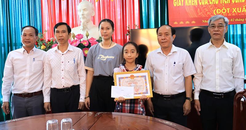 Dịp này, Chủ tịch UBND huyện đã tặng giấy khen và kèm theo số tiền thưởng là 3 triệu đồng cho em Nguyễn Khánh Nhi.