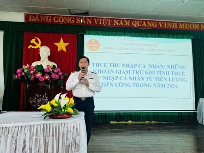 Đại diện Chi cục Thuế khu vực Long Thành - Nhơn Trạch đã phổ biến thông tin đến doanh nghiệp về các khoản đóng BHXH, BHYT được khấu trừ khi tính thuế thu nhập cá nhân.