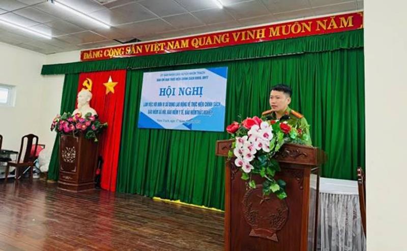 Ông Phạm Mạnh Hùng, Đội trưởng Công an Kinh tế huyện Nhơn Trạch phổ biến các quy định của pháp luật về đóng BHXH, BHYT, BHTN