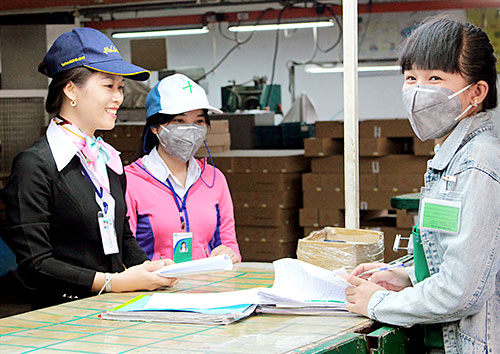 Bí thư Chi bộ Công ty TNHH Advanced Multitech Việt Nam Đỗ Thị Thúy Kiều thăm hỏi công nhân trong giờ làm việc