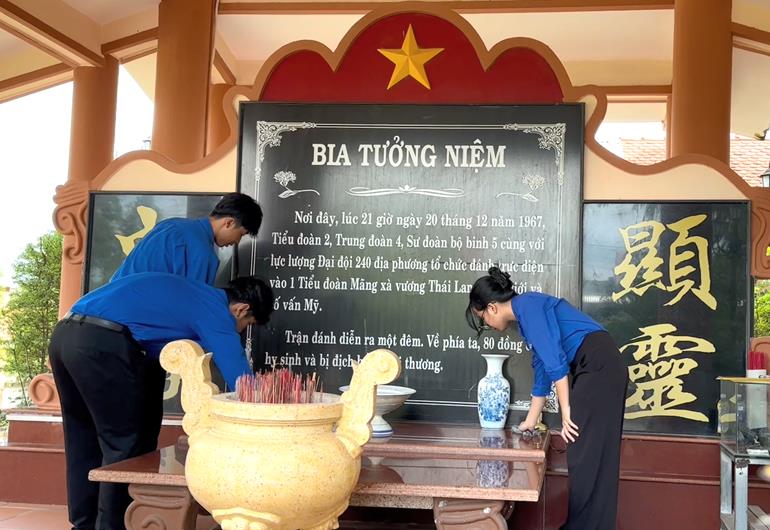 Đoàn viên thanh niên xã Long Thọ quét dọn, vệ sinh tại Di tích Bia tưởng niệm của xã Long Thọ, là địa điểm diễn ra trận đánh giữa Tiểu đoàn 2 (Trung đoàn 4, Sư đoàn 5) và Đại đội 240 Biên Hòa với Tiểu đoàn Mãng Xà vương Thái Lan
