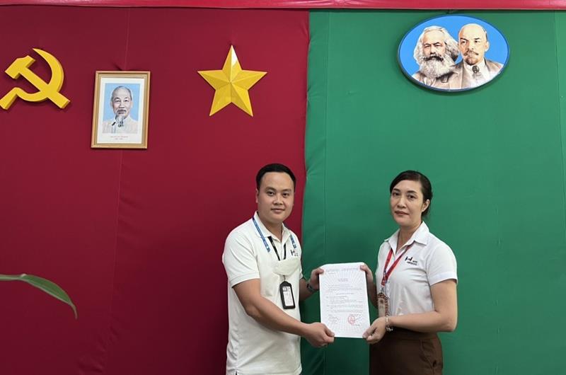 Phó Bí thư Chi bộ Công ty TNHH Hwaseung Vina Đoàn Minh Nhật trao quyết định kết nạp đảng viên mới