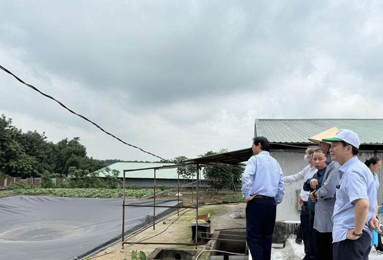 Đoàn công tác tỉnh kiểm tra khu xử lý chất thải chăn nuôi tại một trang trại sản xuất vịt giống trên địa bàn huyện Thống Nhất. Ảnh: Song Lê